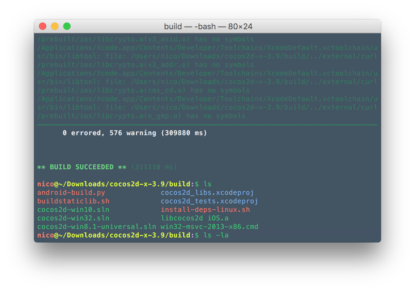 ./buildstaticlib.sh cocos2d_libs.xcodeproj "libcocos2d iOS" - Plug the charger of your Macbook then go to the gym or have lunch or something, because it will take quiet some time to create the static library.